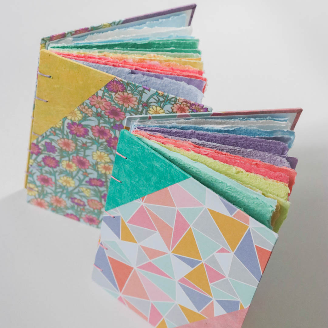 Pour chaque carnet j’ai associé 1 papier indien à motif en début de carnet qui peut-être utilisé comme un marque page et qui participe à protéger les papiers aquarelle. Le ruban et le fil de reliure sont également assortis aux couleurs de chaque carnet.
