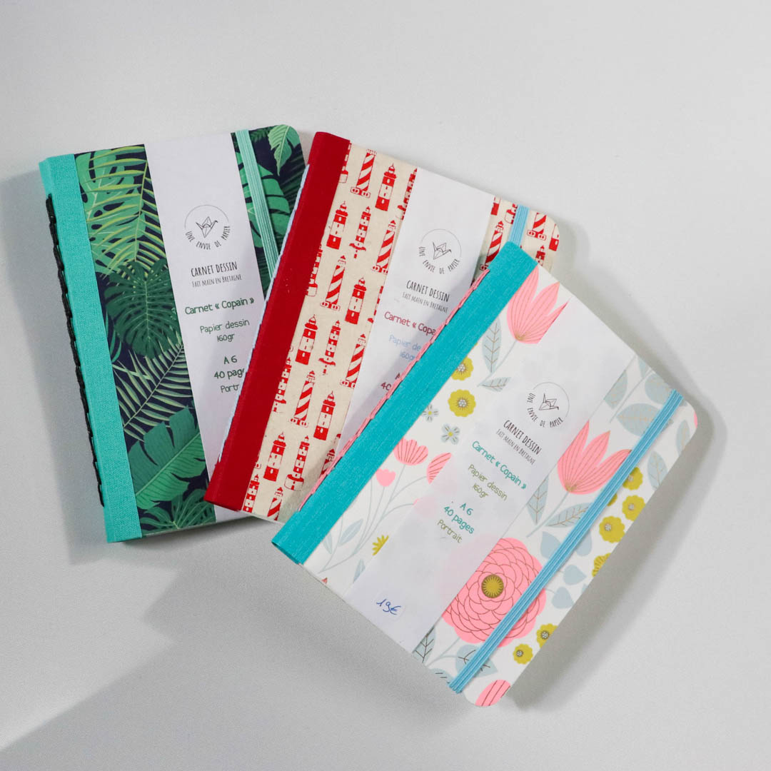 Le carnet est fabriqué à la main à partir de papier dessin blanc. La reliure « copte » est idéale pour permettre une ouverture à plat. La couverture rigide est réalisée avec différents papiers comme le lokta très texturé, du papier indien et encore le papier japonais.